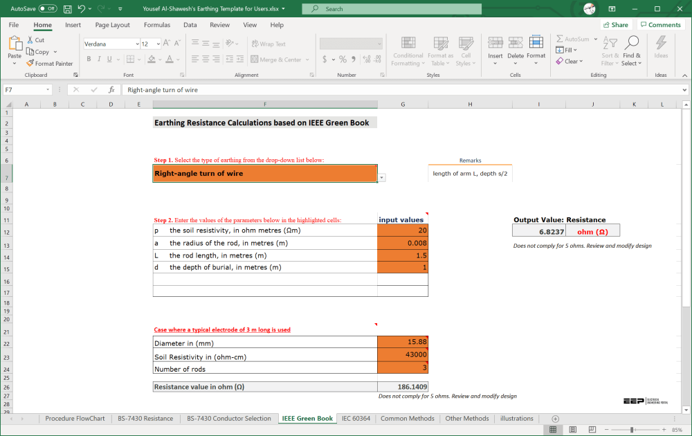 This simple software tool with auto-mathematical functions was developed using Microsoft Excel. This template provides a technically acceptable computer simulation and yet a low-cost solution to the complex issue of effective design of earthing systems according to the standards BS-7430, IEEE-120 Green Book, and IEC-60364. Preliminary layout design is to be conducted after deciding the type of earthing electrode. The resistance of earthing must confirm to the minimum requirement. Further investigation of step and touch voltages is to be made to guarantee that they do not exceed the allowable limits. |